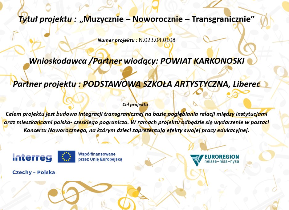 „Z radością informujemy, że Powiat Karkonoski, jako Wnioskodawca i Partner wiodący, otrzymał dofinansowanie na realizację projektu pt. „Muzycznie – Noworocznie – Transgranicznie” Numer projektu: N.023.04.0108” – czytamy w komunikacie.