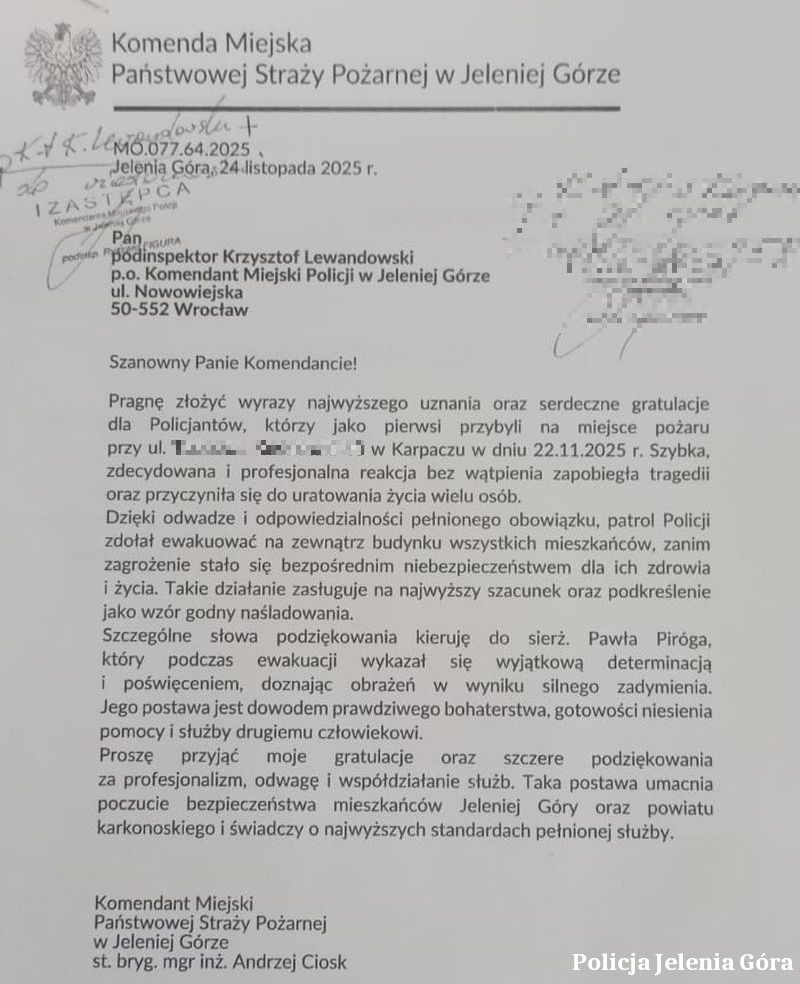 Na ręce Komendanta Miejskiego Policji w Jeleniej Górze, podinsp. Krzysztofa Lewandowskiego, wpłynęły wyjątkowe słowa uznania dla naszych funkcjonariuszy od Komendanta Miejskiej Państwowej Straży Pożarnej w Jeleniej Górze. Podziękowania te dotyczą zdarzenia z 22 listopada 2025 roku, kiedy patrol Policji jako pierwszy dotarł na miejsce pożaru budynku mieszkalnego w Karpaczu.